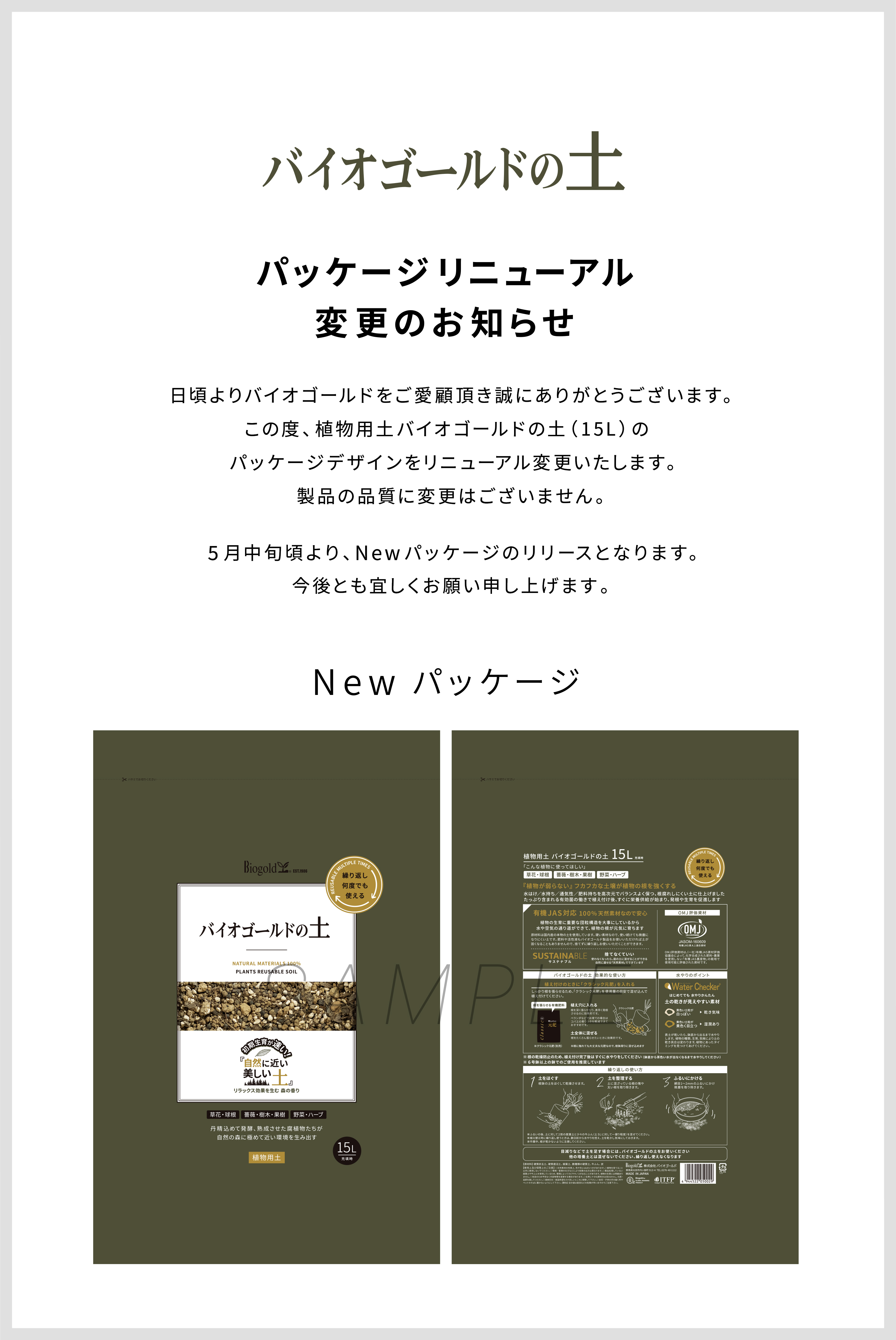 【重要】バイオゴールドの土 15L パッケージリニューアル変更のお知らせ